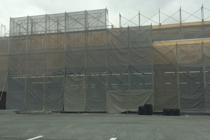 改修用の足場は既存の建物を囲うように構築します。建物の内部では実際に生活したり仕事をしたりする方々がいらっしゃいますので、作業中は騒音や粉塵に十分配慮します。